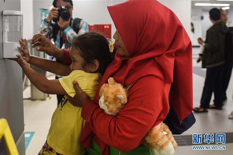 3月3日,在印度尼西亚雅加达,一名母亲抱着女儿挤洗手液。