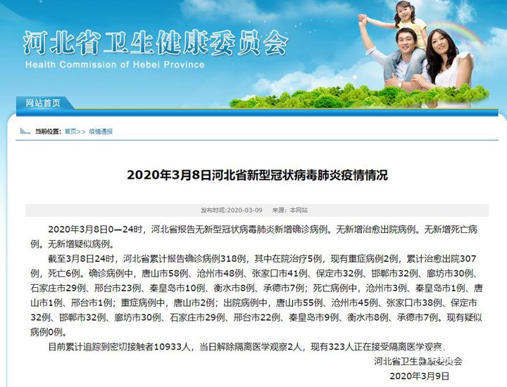 截至3月8日24时,河北省累计报告确诊病例318例,其中在院治疗5例,现有重症病例2例,累计治愈出院307例,死亡6例。确诊病例中,唐山市58例、沧州市48例、张家口市41例、保定市32例、邯郸市32例、廊坊市30例、石家庄市29例、邢台市23例、秦皇岛市10例、衡水市8例、承德市7例;死亡病例中,沧州市3例、秦皇岛市1例、唐山市1例、邢台市1例;重症病例中,唐山市2例;出院病例中,唐山市55例、沧州市45例、张家口市38例、保定市32例、邯郸市32例、廊坊市30例、石家庄市29例、邢台市22例、秦皇岛市9例、衡水市8例、承德市7例。现有疑似病例0例。