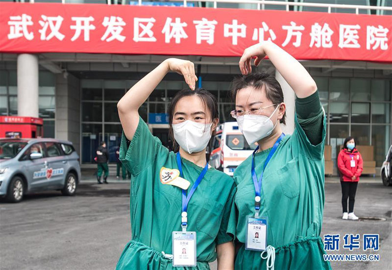 当日,随着最后一批患者康复出院,武汉体育中心方舱医院正式休舱。休舱后,医务人员在舱前合影留念。 新华社记者 肖艺九 摄