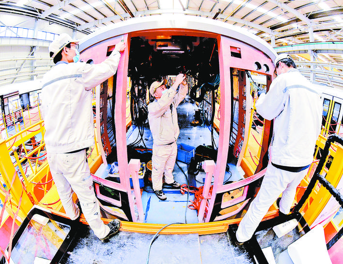 中车齐车集团石家庄公司员工正在安装石家庄地铁2号线车辆线路。 记者 任光阳 通讯员 李明发 摄