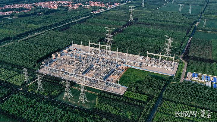 铁塔林立,一条条如银线般的高压电线顺着塔肩引入中都换流站。中都换流站是张北柔直工程重要送端换流站之一,承担着为北京提供“绿电”的重任。